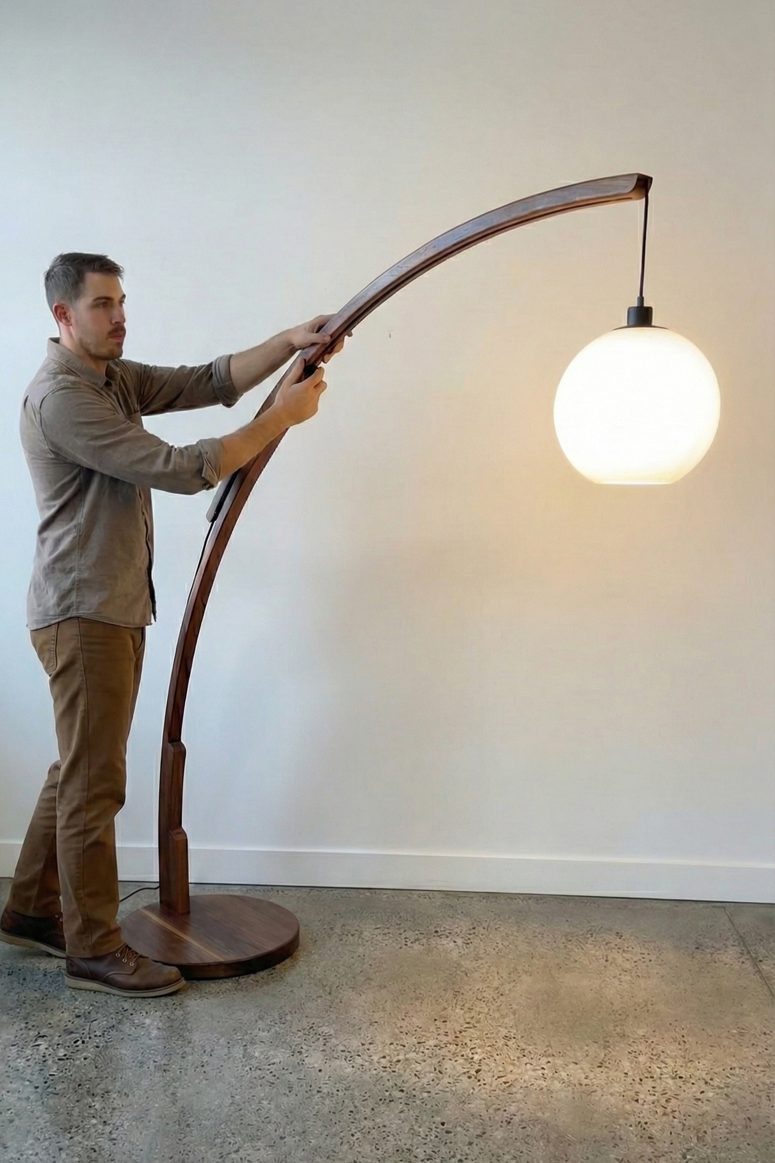 Arche has an adjustable arm and lamp cord arching to a maximum height of 80” and adjusts to a minimum height of 68” with a total reach length of 65”. The lamp comes with a white 20” drum shade or 12” globe.