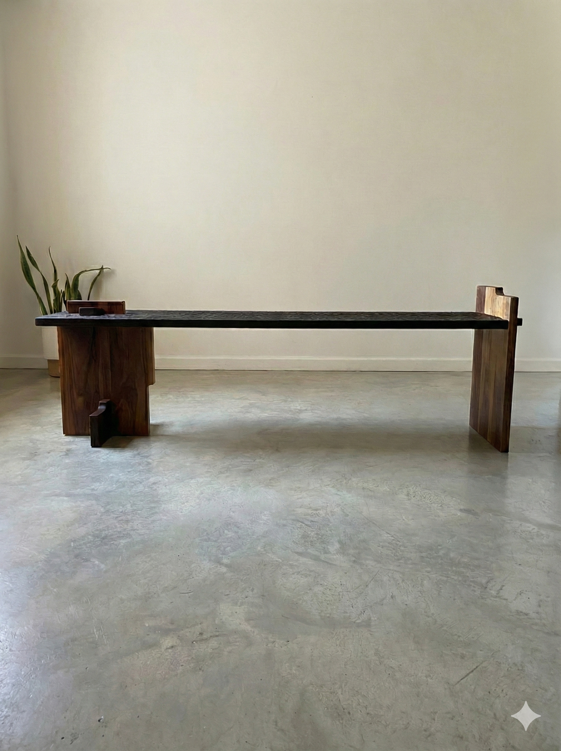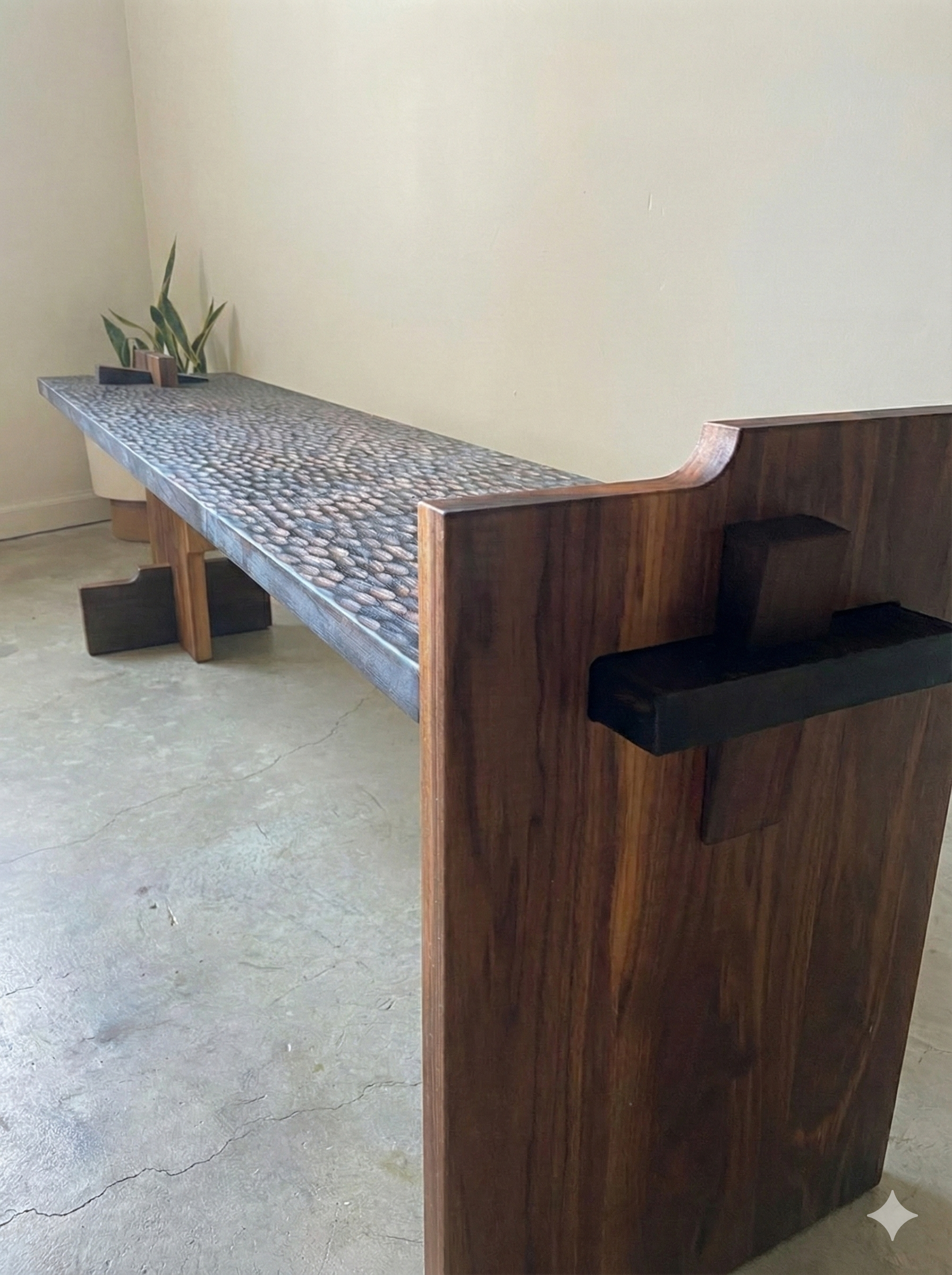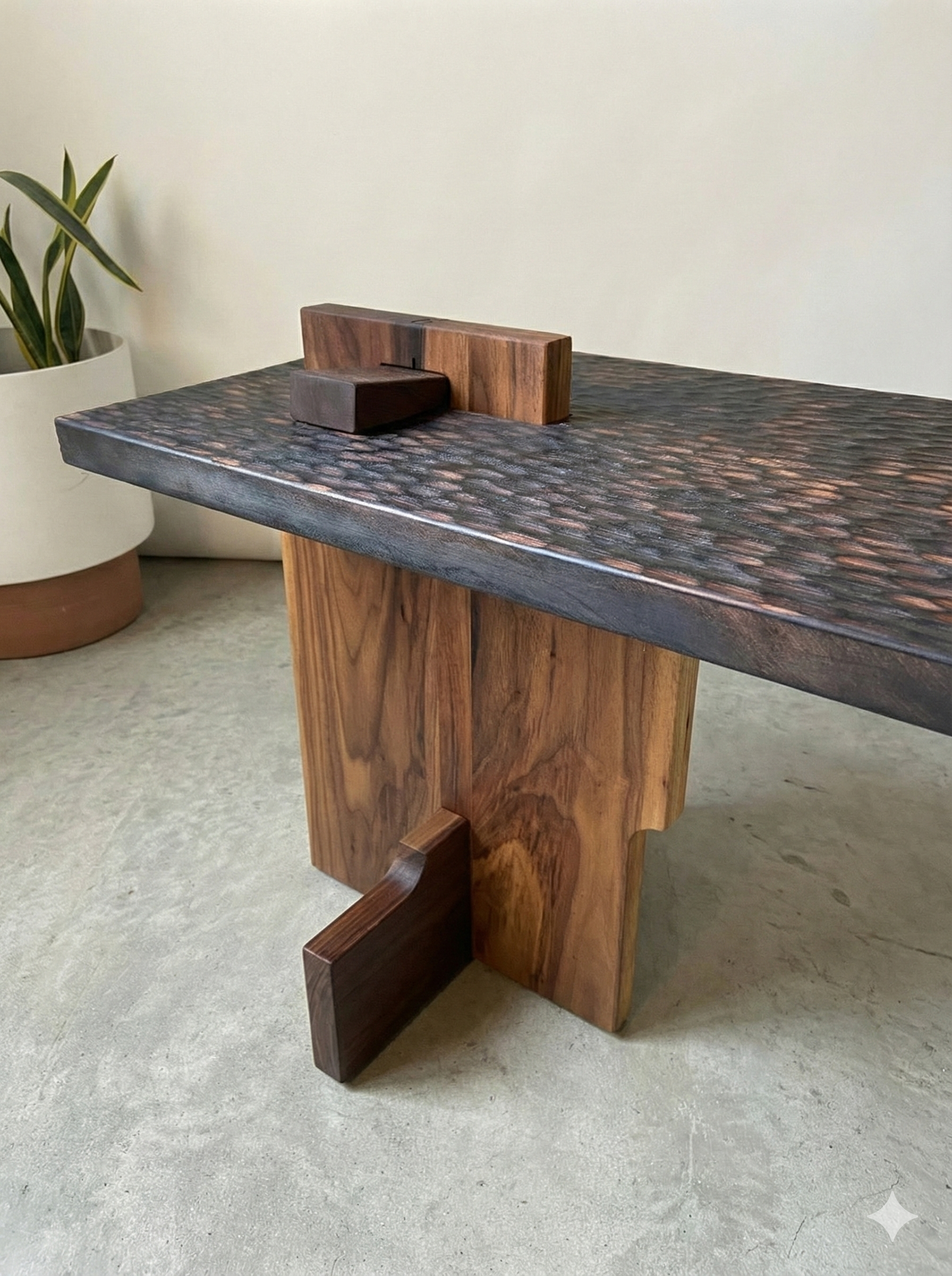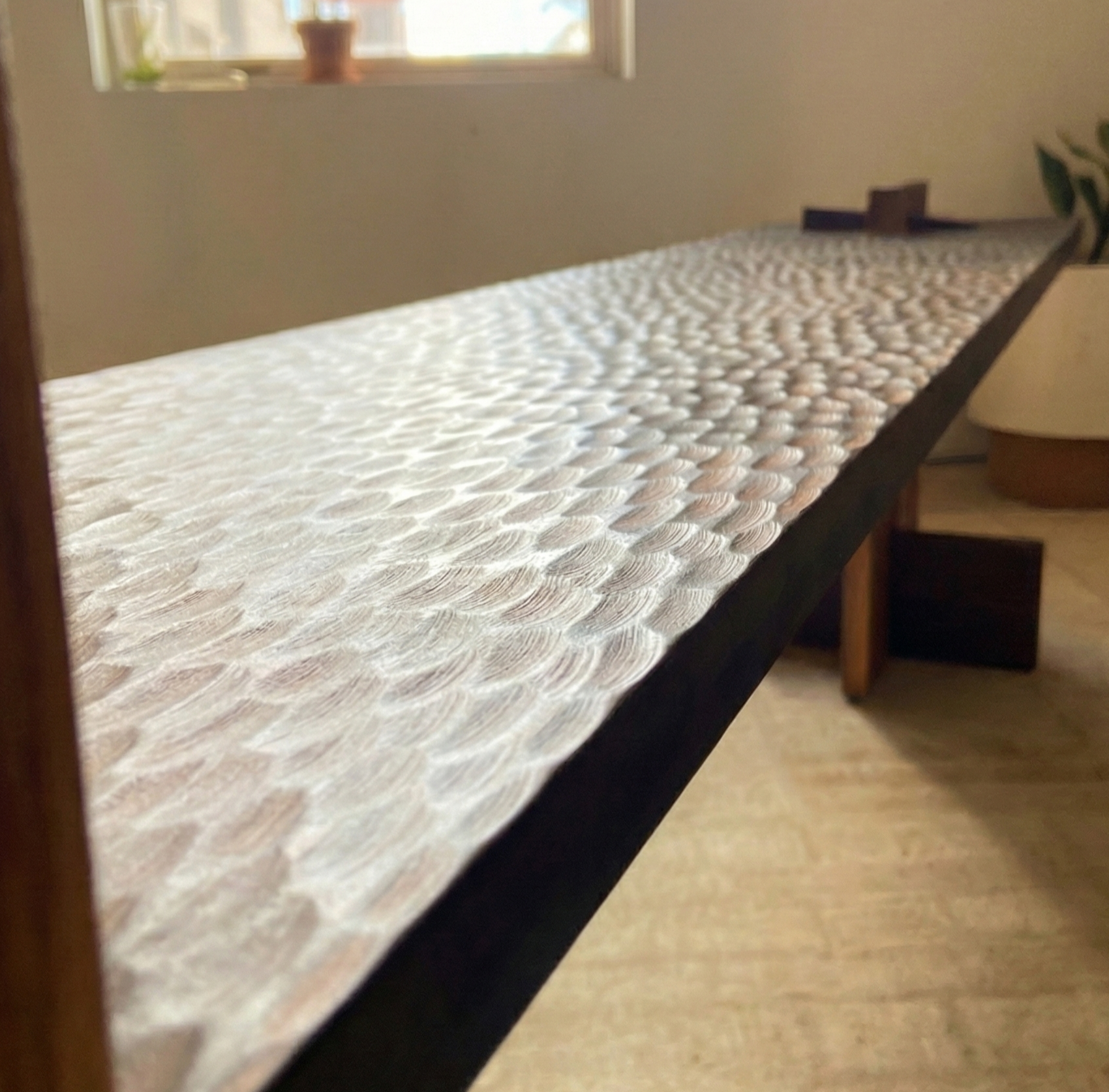 Izak began as a playful experiment that rapidly evolved into a beloved favorite. The intricately carved and carefully charred top presents a distinctive texture that draws the eye, while the walnut legs provide a striking visual contrast, beautifully distinguishing themselves from the rest of the piece. Izak can easily be customized with different wood types and dimensions with one idea of making it into an entry way table.